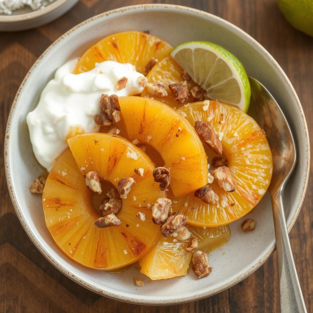 Jeg ville lage en sunnere versjon av karamellisert ananas, og ved å bruke honning i stedet for raffinert sukker fikk jeg den samme deilige karamelliseringen, men på en mer naturlig måte. En klype kanel og et lite dryss havsalt gir dybde, mens ristede nøtter tilfører en deilig sprø kontrast.