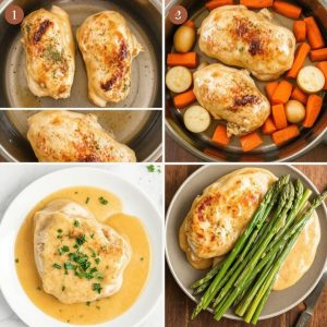 Saftig kyllingfilet med kremet appelsinsaus og ovnsbakte grønnsaker