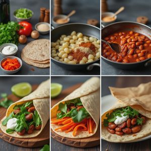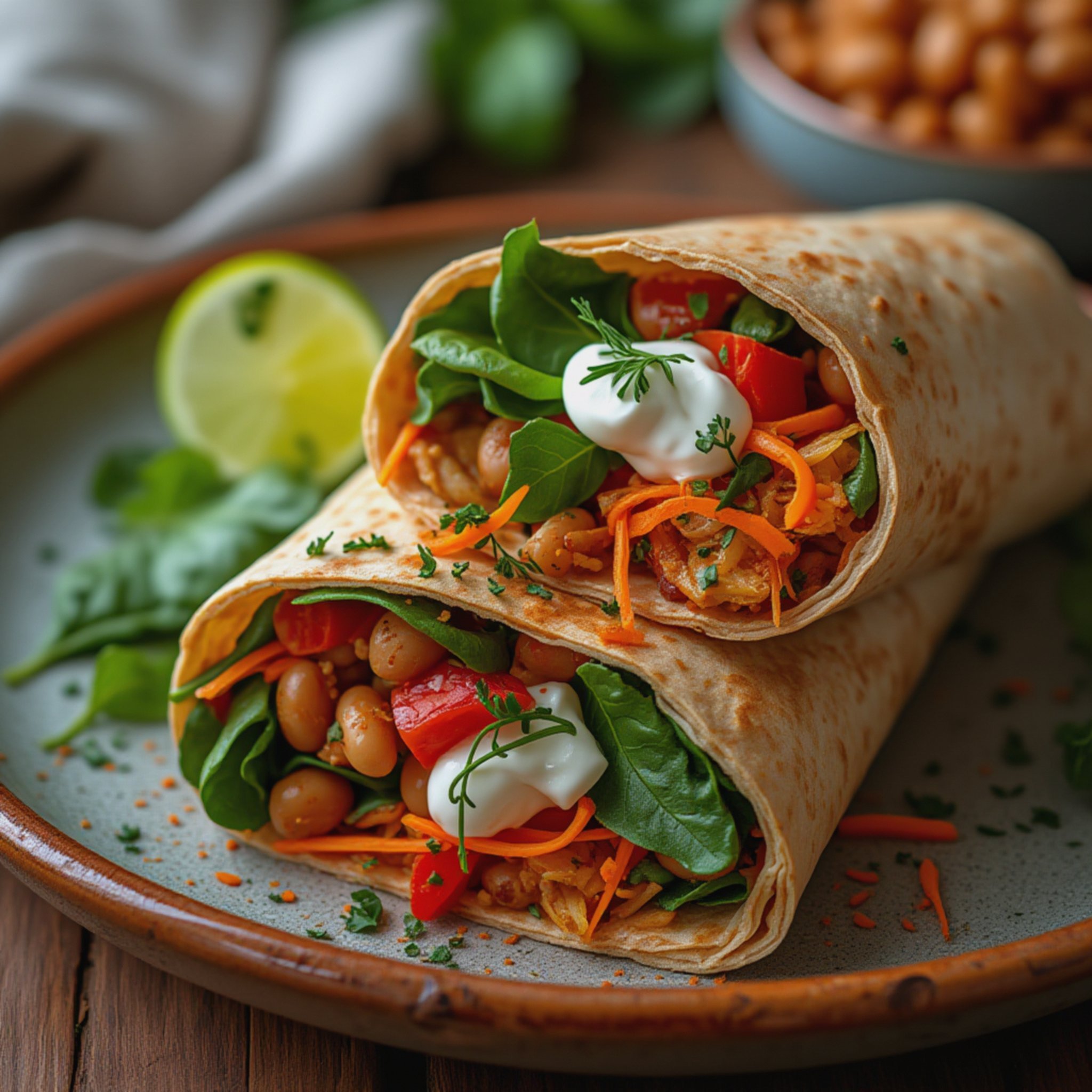 Jeg liker best når wrapsene får en god balanse mellom det varme, myke og det sprø, friske. Den krydrede bønneblandingen har både tyngde og varme fra hvitløk, paprika og spisskummen. Samtidig gir grønnsakene en krisp kontrast – spesielt paprika og gulrot. Yoghurt på toppen gir en kjølende og kremet avslutning som gjør retten komplett. Hver bit er en liten eksplosjon av smaker: mildt krydret, friskt og litt syrlig. Det er noe veldig tilfredsstillende med den tykke, grove wrapen som holder alt på plass og gjør måltidet både lett og mettende.