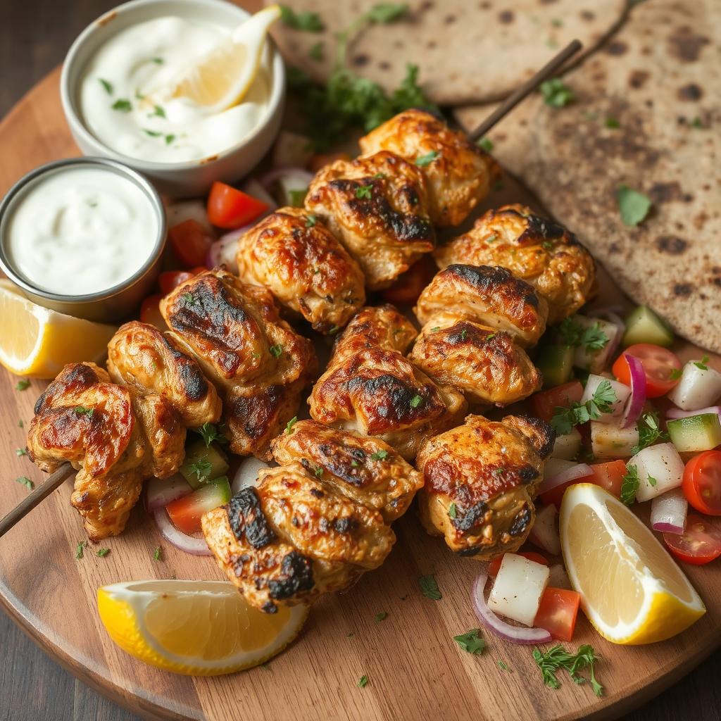 Jeg elsker hvordan disse kyllingspydene kombinerer den saftige kyllingkjøttets milde smak med den friske sitronens syrlighet og oreganoens aromatiske, litt skarpe urtenoter. Når kyllingen grilles, får den en gyllen, litt sprø overflate som bryter nydelig med det møre og saftige kjøttet inni. Dressingen med yoghurt og mynte gir et friskt og kjølende preg som balanserer grillens intense smaker. Salaten med tomat, agurk og rødløk tilfører både knas og saftighet, og gir hele retten en herlig friskhet jeg setter stor pris på.