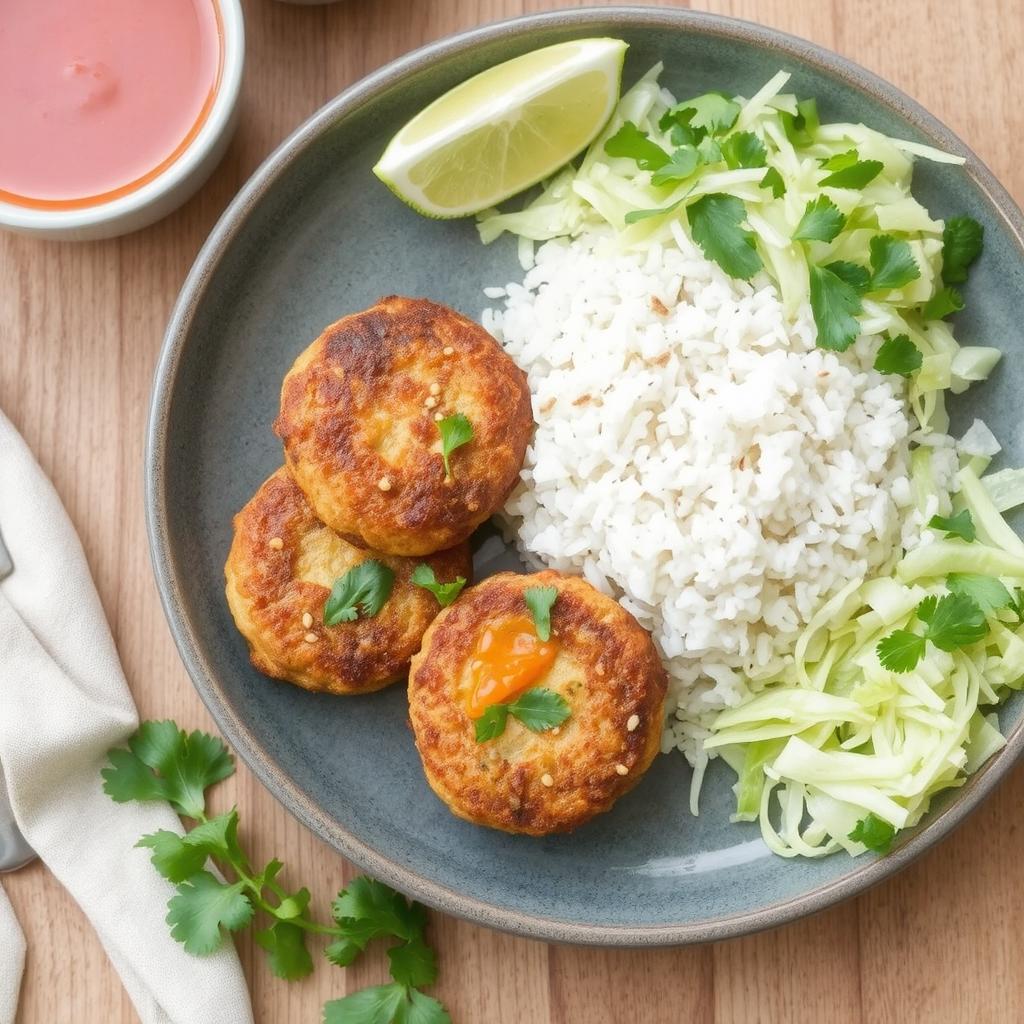 Servering: Anrett fiskekakene på en tallerken og server med ris, kålsalat og dippen. Nyt dem varme, rett fra pannen.