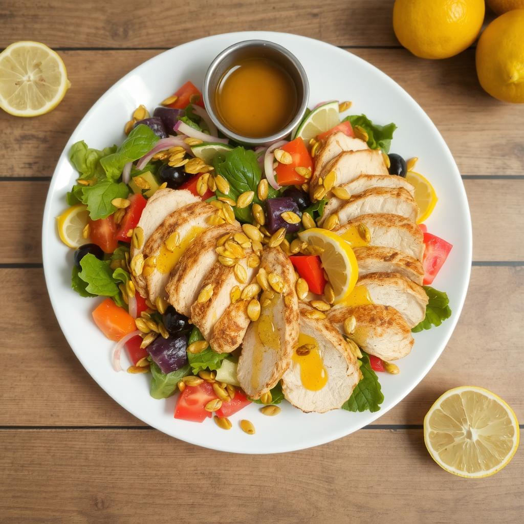 - Skjær kyllingfiletene i skiver og legg dem over salaten. Drypp dressingen over og topp med ristede solsikkefrø rett før servering.