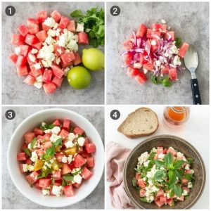 - Skjær vannmelon i jevne terninger og legg dem i en stor salatbolle.