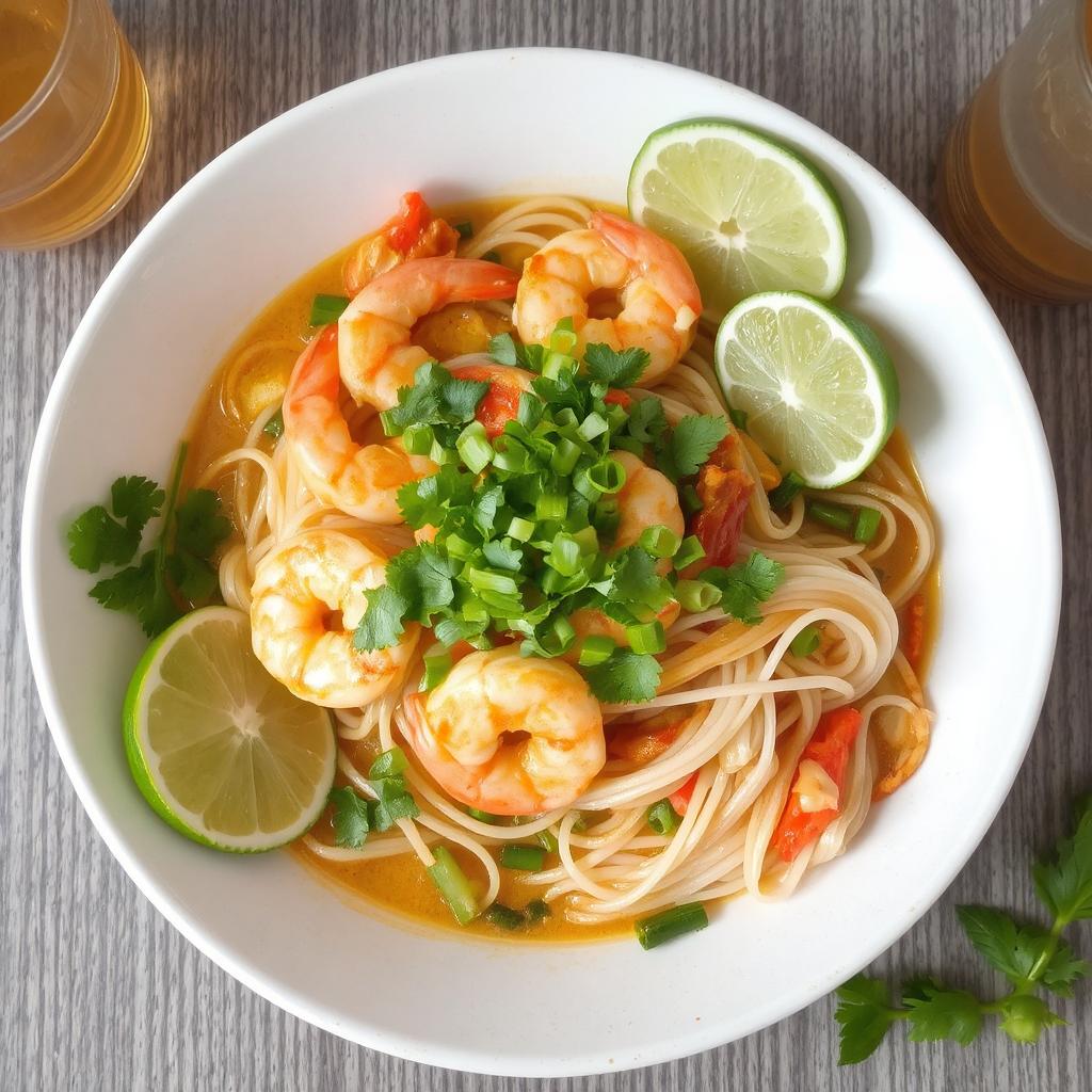 Servering: Legg nudlene på tallerkener, topp med rekene, vårløk og koriander. Server med limebåter for ekstra friskhet.