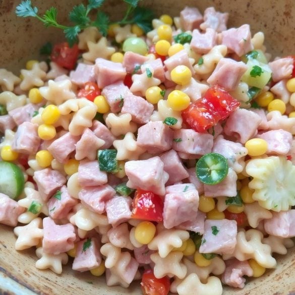 Skinke- og pastasalat byr på en herlig blanding av smaker og teksturer. Den kokte pastaen er myk og lett absorberende, noe som gjør at dressingen virkelig kommer til sin rett. Skinken tilfører en salt og rik smak, som balanseres av de sprø grønnsakene som paprika og agurk. Maisen gir en mild sødme og en saftig tekstur. Dressingen, med et hint av sennep og frisk sitronsaft, gir en kremet, pikant dybde som binder alt sammen. Toppet med ferske urter, får salaten et løft som gjør hver bit like spennende.