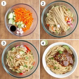 Soba-nudelsalat byr på en perfekt balanse mellom det friske og det salte. Nudlene er myke og lett seige, mens grønnsakene gir en sprø kontrast. Dressingen, med soyasaus og riseddik, gir en subtil kombinasjon av syre og umami, mens sesamoljen tilfører en nøtteaktig dybde. Til slutt gir sesamfrøene en deilig crunch og en rik smak som hever retten til nye høyder.