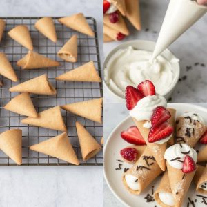Søte cones med mascarponekrem er en moderne dessert som kombinerer sprø, søte kjekscones med en fløyelsmyk krem laget av mascarpone. Denne kombinasjonen er inspirert av både italienske desserter og tradisjonelle iskremcones. Mascarpone er en kremet ferskost fra Italia som tilfører en rik smak og luksuriøs tekstur til desserten. Jeg elsker disse søte cones fordi de er både elegante og enkle å servere – perfekte til selskaper, pikniker eller når du bare vil unne deg noe ekstra godt.