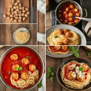 - Servering: Fordel spaghetti på tallerkener, topp med kjøttboller og saus, og pynt med parmesan og basilikum.