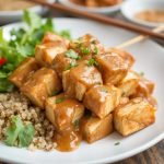 - Kombiner tofu og saus: Legg den stekte tofuen tilbake i pannen og hell sausen over. La det småkoke i 3-4 minutter til tofuen er godt dekket med sausen.