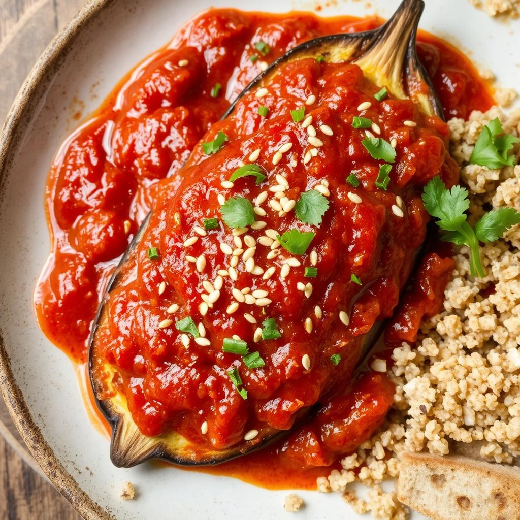 - Servering: Legg de bakte auberginene på et fat, topp med den krydrede tomatsausen og dryss over ristede sesamfrø og friske urter. Server med fullkornsris, quinoa eller brød.