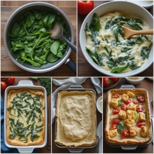 Visp sammen yoghurt, egg, havremel, salt, muskat, pepper og dill i en stor bolle. Vend inn den avkjølte spinat- og løkblandingen.