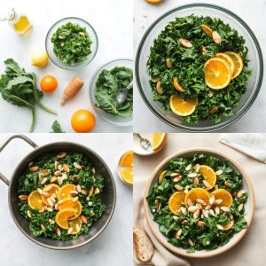 Det jeg elsker med denne salaten, er kontrastene. Den mørkegrønne grønnkålen gir litt motstand og en mild bitterhet som virkelig kommer til sin rett når den blir massert med olivenolje og sitronsaft. Appelsinfiletene er søte, saftige og nesten parfymert friske – de smelter i munnen og løfter hele retten. Mandler gir det nydelige knaset jeg alltid savner i en god salat, og litt flaksalt og pepper runder det hele av. Hver munnfull er som et lite spill av smaker og teksturer, og jeg blir alltid overrasket over hvor enkelt det er å lage noe så godt.