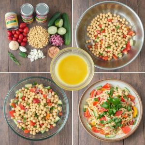 - Kutt grønnsakene: Del cherrytomatene i to, skjær agurken i små terninger, paprikaen i biter, og finhakk rødløken. Ha alle grønnsakene i en stor bolle sammen med kikerter og hakket persille eller koriander.