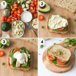 - Monter sandwichen: Smør dressingen på den ene brødskiven og most avokado på den andre. Legg spinat, tomat og kylling mellom brødskivene.