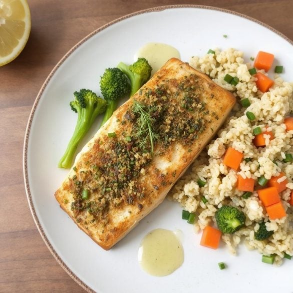 - Server steinbiten med dampede grønnsaker, poteter eller quinoa, og en skvett sitrondressing over grønnsakene.