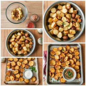 Vask potetene grundig og skjær dem i terninger eller båter. La skallet være på for ekstra sprøhet og tekstur. - Bland krydder og olje: