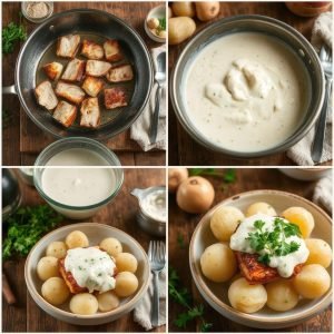 - Lag persillesausen: Smelt smør i en kjele. Rør inn hvetemel og la det frese i 1 minutt. Spe gradvis med melk under konstant omrøring til sausen er jevn og kremet. La småkoke i 3-4 minutter.