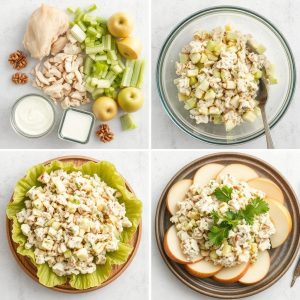 - Forbered ingrediensene: Kok og strimle hønsekjøttet hvis det ikke allerede er klart. Kutt eple, selleri og druer i passende biter, og grovhakk valnøttene.