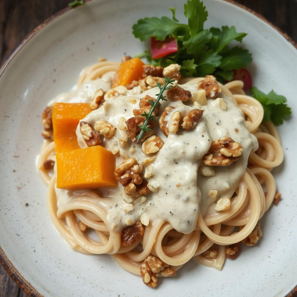 Denne pastaretten er en liten symfoni av smaker og teksturer. Den myke, kremete sausen smelter sammen med pastaen og gir en fyldig og fløyelsmyk munnfølelse. Gresskaret tilfører en naturlig sødme som harmonerer perfekt med den lette nøtteaktige bitterheten fra valnøttene. Litt friskpresset sitron og et dryss næringsgjær gir en lett syrlighet og umami, som gjør at retten føles balansert og full av dybde. Valnøttene gir en deilig knasende kontrast, og et hint av muskatnøtt runder det hele av med en varm og krydret undertone. Jeg liker å strø litt ristede gresskarkjerner over for ekstra crunch – det gir en deilig tekstur mot den silkemyke sausen.