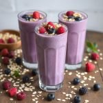 Denne smoothien gir en fløyelsmyk følelse i hver slurk. Havremelken tilfører en mild, kremet base som balanserer de syrlige tonene fra bringebærene og blåbærene. Den naturlige sødmen fra honning løfter smaken akkurat nok uten å overdøve de friske bærene. Toppingen av granola tilfører en deilig knasende kontrast, mens en håndfull ferske bær gjør det både vakkert og friskt. Det er en glede å servere denne både til familien og gjester – den ser like lekker ut som den smaker!