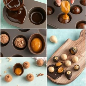 Fyll de avkjølte sjokoladeskallene med karamellen, og dekk med et nytt lag sjokolade. Sett i fryseren til de er faste.Lag energikuler