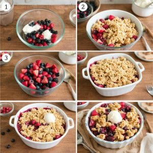 - Strø Over Topping: Fordel smuldretoppingen jevnt over bærene.