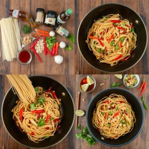 Servering: Fordel nudlene på tallerkener, topp med peanøtter, vårløk og koriander. Server med limebåter for ekstra friskhet.