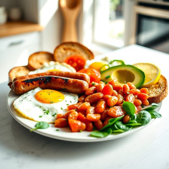 Tips: Bytt ut pølsene: Du kan erstatte pølsene med grillet kylling eller laks for en annen vri. Legg til ekstra grønnsaker: Tilsett sopp, asparges eller grillede grønnsaker for enda mer fiber og smak. Server med en kopp grønn te eller en smoothie for en ekstra sunn start på dagen. Dette måltidet er en sunnere versjon av en klassisk engelsk frokost, og det er fylt med proteiner fra eggene og pølsene, samt fiber fra grønnsakene og fullkornsbrødet.
