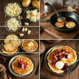 Potetpannekaker er myke og har en mild smak som harmonerer godt med det sprø og salte flesket. Flesket tilfører en knasende tekstur som løfter retten. Jeg elsker hvordan pannekakene også kan tilpasses med ulike krydder eller urter for en ekstra smaksdimensjon.