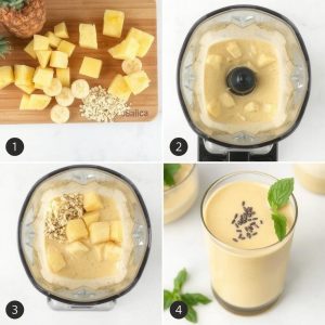 eg laget denne ananas smoothien første gang da jeg ønsket en frisk og næringsrik måte å starte dagen på. Den søte ananasen gir en tropisk smak, og havre gir smoothien en deilig kremet tekstur. Jeg har alltid hatt lyst til å lage en smoothie som både er sunn og smakfull, og denne ble umiddelbart en favoritt. Kombinasjonen av frukt og havre fungerer utrolig godt, og jeg har fått mange positive tilbakemeldinger fra familien. Nå er den en fast del av min ukentlige frokostrutine – enkel, rask og full av energi!