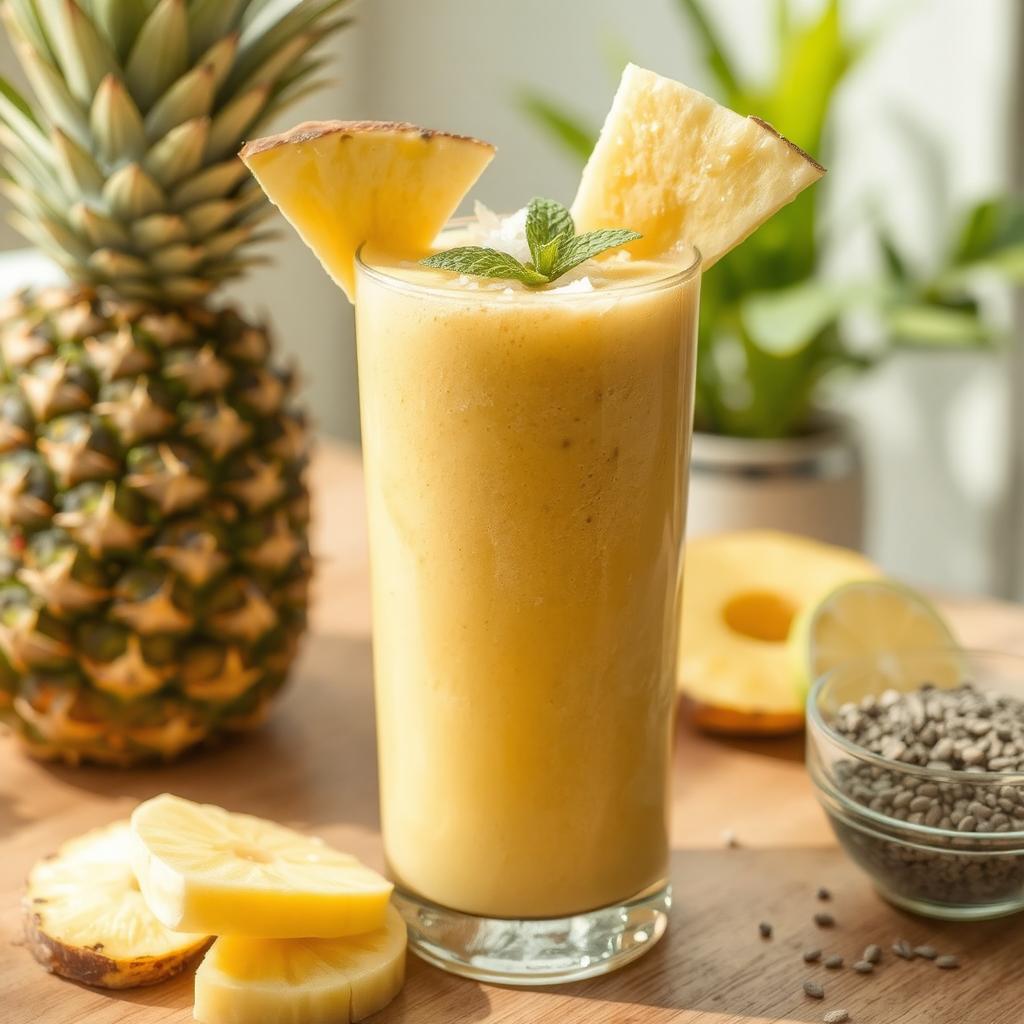Denne smoothien er rett og slett som en tropisk bris på glass. Den har en fløyelsmyk tekstur med små, næringsrike prikker fra chiafrøene. Smaken er søt, syrlig og sval – ananasen gir en herlig syrlighet, bananen runder det hele av, og kokosvannet bringer en lett, nøtteaktig friskhet. Jeg kjenner hvordan smaken danser mellom søtt og friskt, mens lime og ingefær gir et lite sting som frisker opp. Konsistensen er akkurat passe tykk, slik jeg liker det. Jeg serverer den iskald, gjerne med litt pynt på toppen – det føles som en liten spa-opplevelse i hverdagen.