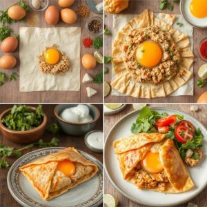 - Fyll brik: Legg en skje tunfiskblanding midt på deigen. Lag en liten fordypning og knekk et egg forsiktig over fyllet.