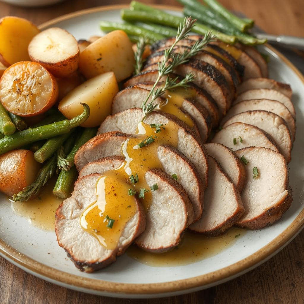 Denne retten har en delikat balanse av mørt svinekjøtt som er lett krydret med hvitløk, sitronsaft og timian. Kjøttet blir saftig og får en sprø overflate når det stekes. Jeg elsker hvordan smakene av sitrus og urter fremhever kjøttets naturlige sødme. Retten gir en deilig kontrast mellom den sprø stekeskorpen og det saftige kjøttet inni.