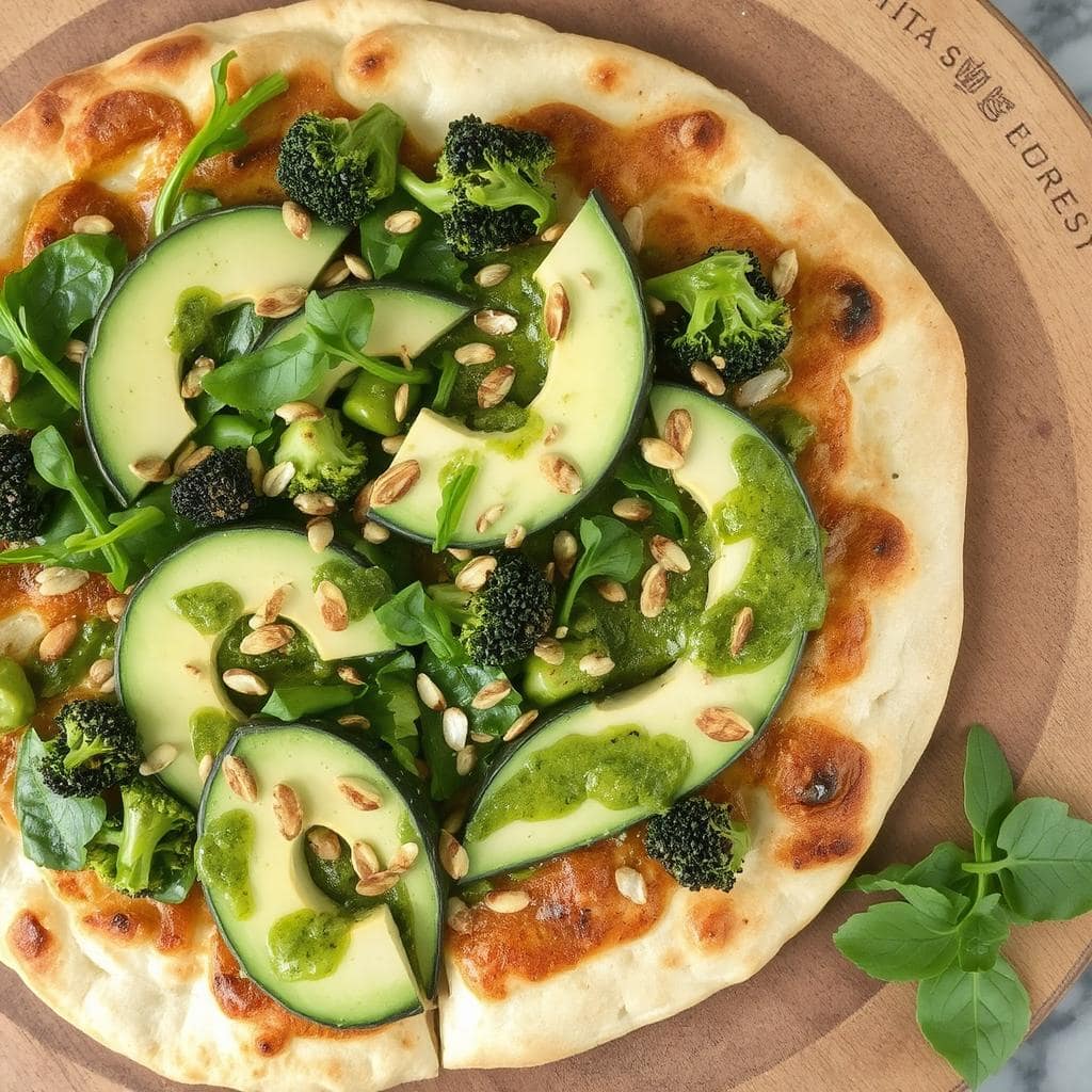 Grønnsakene, som zucchini, spinat og brokkoli, legger seg som et vakkert, grønt teppe over pizzabunnen. Tynne skiver av avokado gir en kremet kontrast, mens et dryss med ristede solsikkefrø tilfører en lett knasende tekstur. Etter steking toppes pizzaen med ferske urter og en squeeze med sitronsaft for en frisk og aromatisk finish.